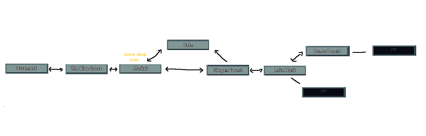 I feel like traveling between areas should be faster, especially when you need to go from one store to another, to sell or buy something, it takes a lot of time. With the travel, I still think a map would help, like just an UI of connected paths with a scrollbar, something like this maybe: